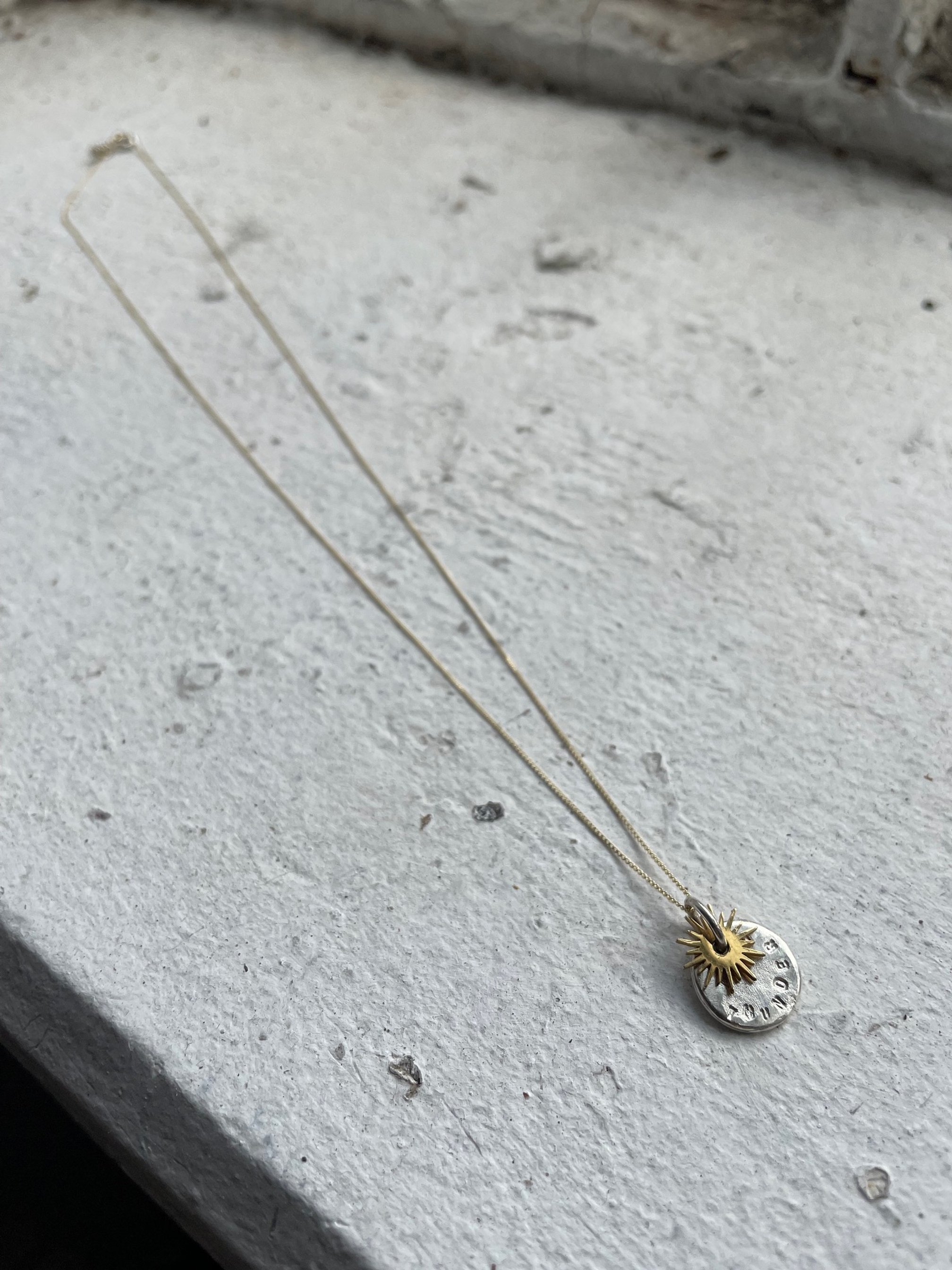 A delicate 9k gold fine chain holds a layered pendant of symbolic contrast and light.